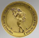 Στρογγυλή σφραγίδα "Ιατρική Σχολή του Εθνικού Πανεπιστημίου" με τον Ασκληπιό καθισμένο έχοντας τον όφι στα πόδια του. Κράμμα λευκού μετάλλου.